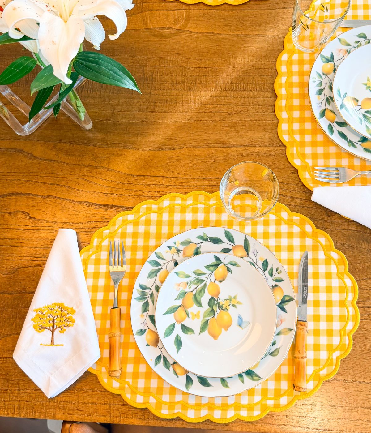 Com design versátil e encantador, o jogo americano dupla face permite diferentes composições: um lado em xadrez amarelo, que transmite leveza e feminilidade, e o outro em amarelo liso, ideal para ocasiões mais clássicas e elegantes. Essa versatilidade torna o conjunto perfeito tanto para o uso diário quanto para momentos especiais.