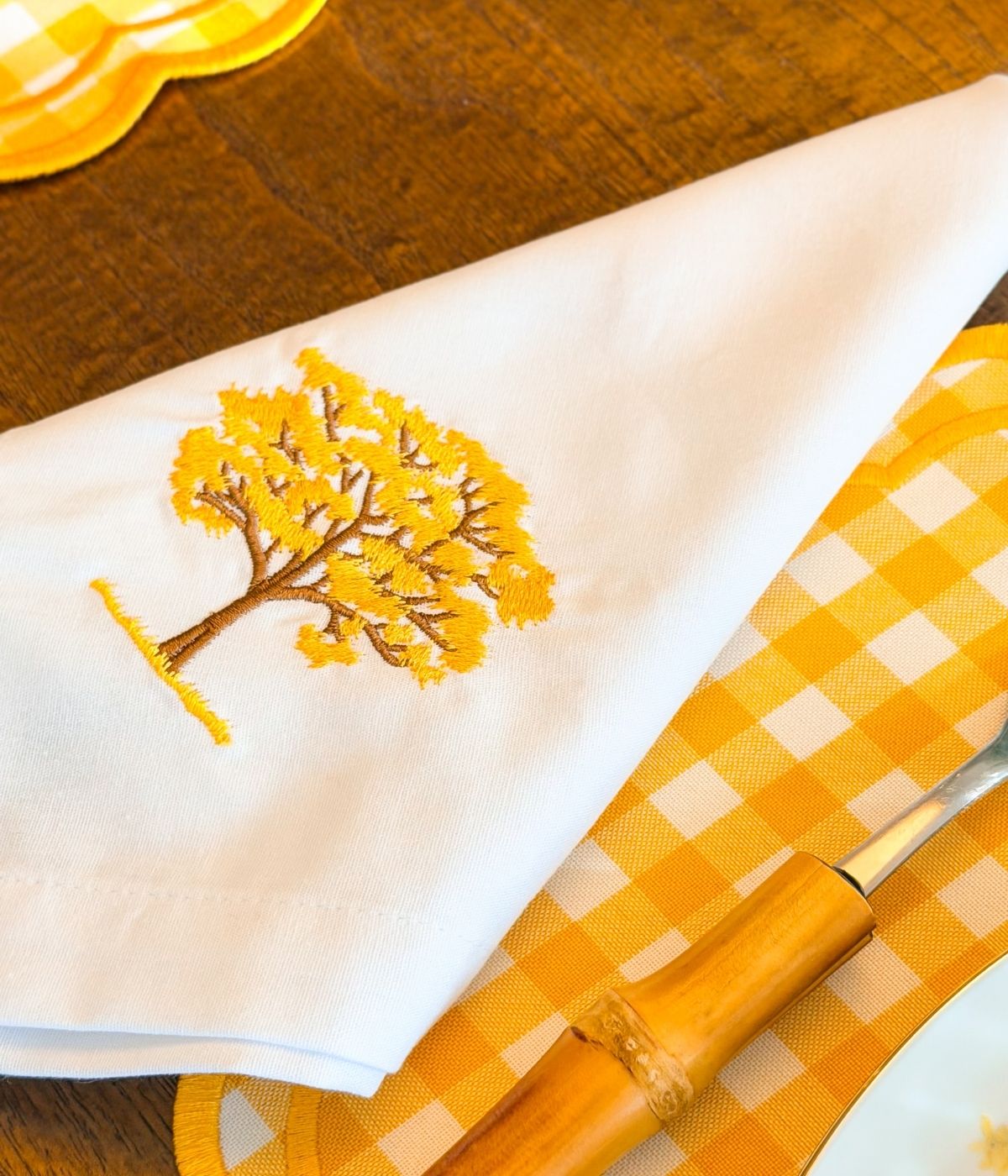 Traga delicadeza, elegância e um toque romântico à sua mesa com o Conjunto Ipê amarelo , composto por jogo americano dupla face em tecido xadrez amarelo e guardanapo em linho misto branco com bordado artesanal de flores de ipê amarelo.
