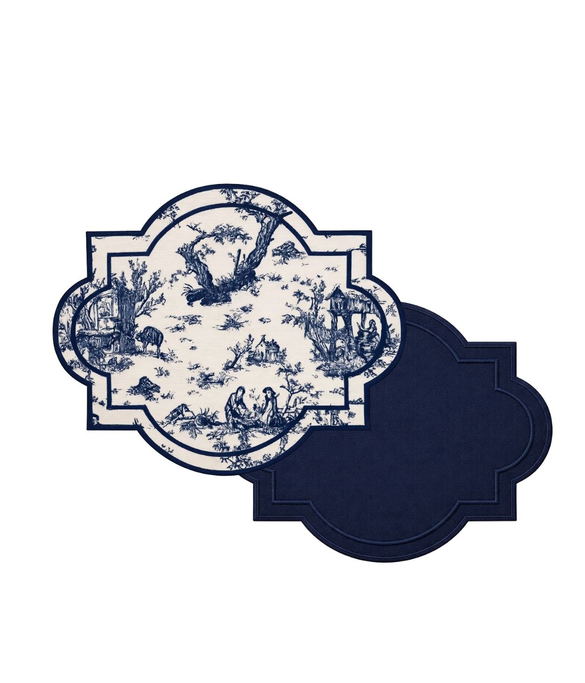 De um lado, a estampa toile de jouy em branco e azul oferece um charme tradicional, remetendo a composições históricas e artísticas, enquanto o outro lado, em azul marinho sólido, permite criar uma mesa mais contemporânea e elegante. Ideal para alternar entre ocasiões formais e informais, este item se adapta facilmente a diferentes estilos de louças, talheres e acessórios, garantindo uma mesa sempre harmoniosa e sofisticada.